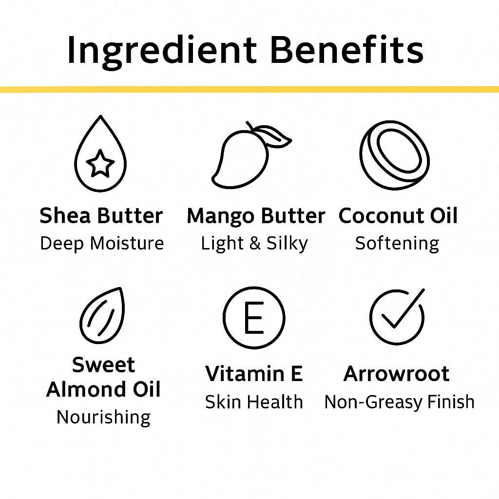 Mango Butter - Lightweight hydration, smooths rough patches, supports elasticity