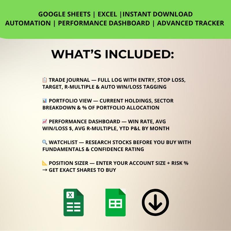 π Trade Journal β Full log with entry, stop loss, target, R-multiple & auto Win/Loss tagging π Portfolio View β Current holdings, sector breakdown & % of portfolio allocation π Performance Dashboard β Win rate, avg win/loss $, avg R-multiple, YTD P&L by month π Watchlist β Research stocks BEFORE you buy with fundamentals & confidence rating π Position Sizer β Enter your account size + risk % β get exact shares to buy π Strategy Library β Document, score & refine your best trading setups