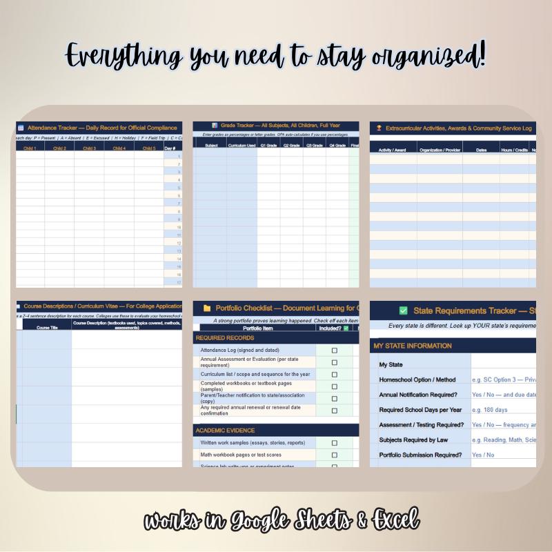1. Purchase and download instantly 2. Open in Google Sheets or Excel 3. Start with the State Requirements tab β know your rules first 4. Set up Attendance and Grade Tracker at the start of each school year