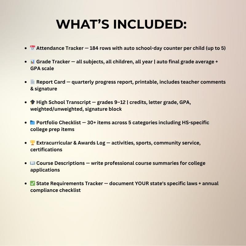 Everything your homeschool needs to stay organized, stay compliant, and be ready for anything β college applications, portfolio reviews, co-op enrollments, or simply knowing your records are clean.