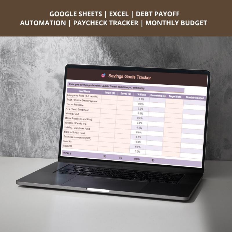 🎯 Savings Goals Track up to 12 savings goals at once. Auto-calculates % complete, remaining balance, and how much you need to save per month based on your target date.