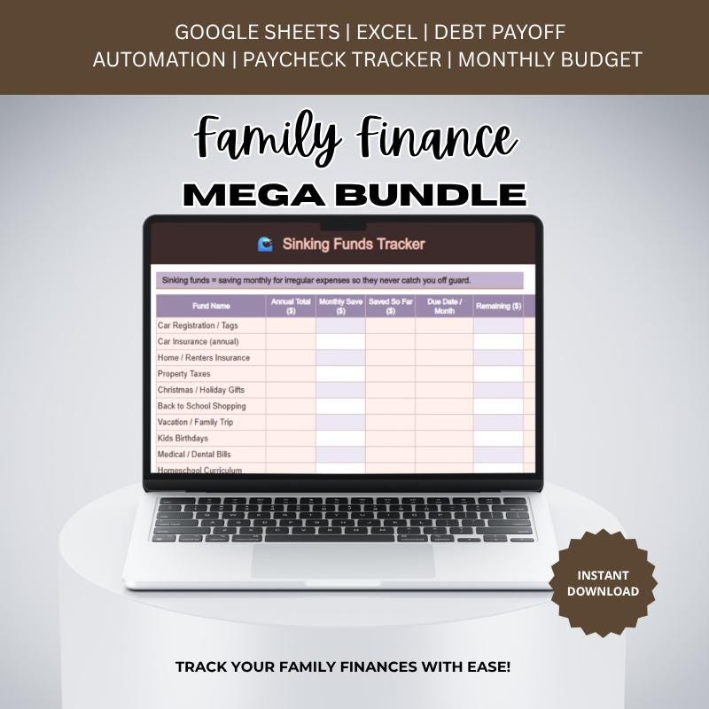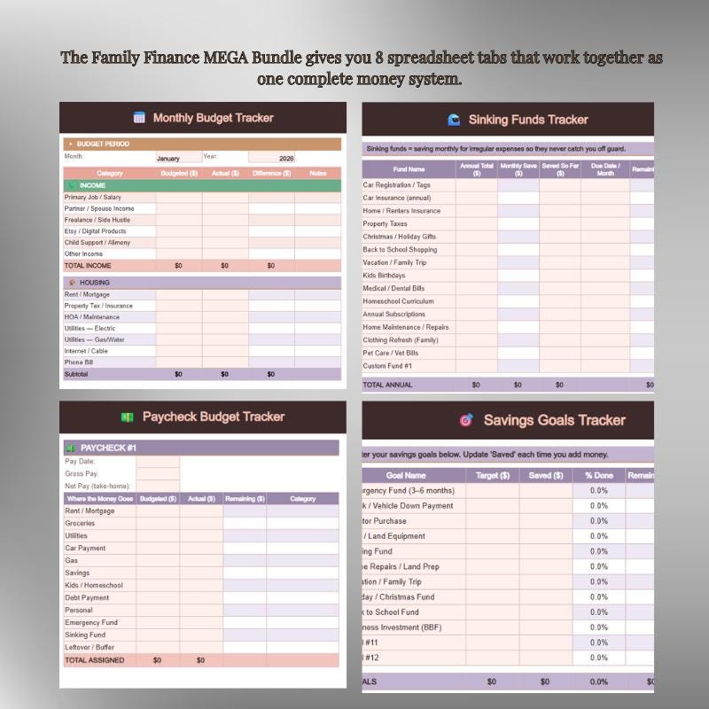 The Family Finance MEGA Bundle gives you 8 beautifully designed spreadsheet tabs that work together as one complete money system. Track income, assign every paycheck, crush debt, build savings, plan for irregular expenses, and see your whole year at a glance — all in one file.