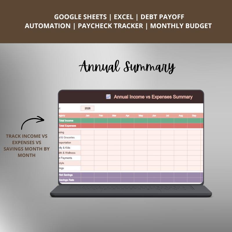 📈 Annual Summary Birds-eye view of your entire year. Track income vs. expenses vs. savings month by month and see your annual totals and savings rate.