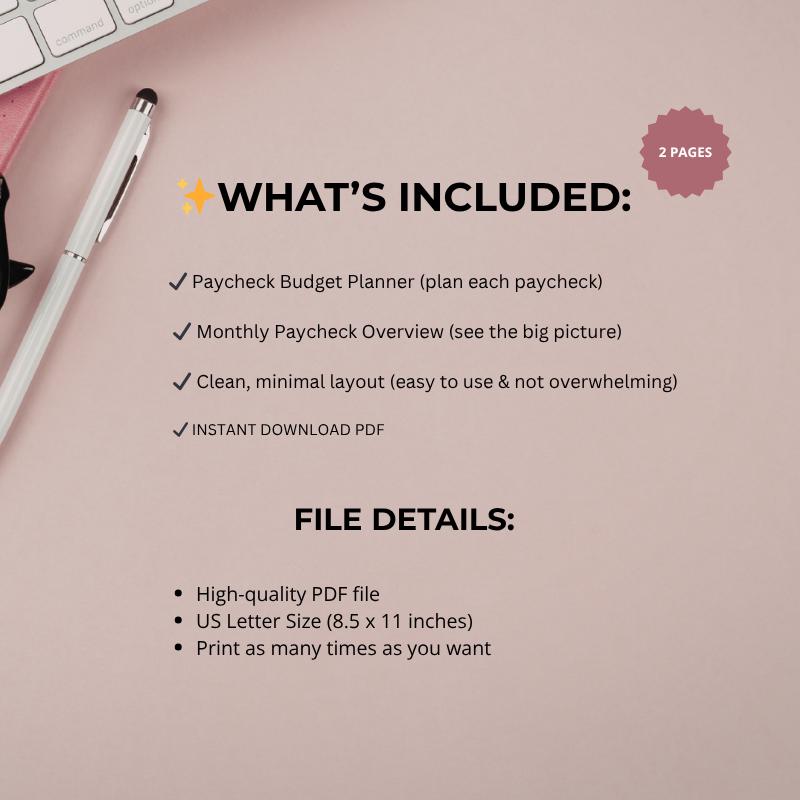 ✨ What’s Included: ✔ Paycheck Budget Planner (plan each paycheck) ✔ Monthly Paycheck Overview (see the big picture) ✔ Clean, minimal layout (easy to use & not overwhelming) ✔ Instant download PDF