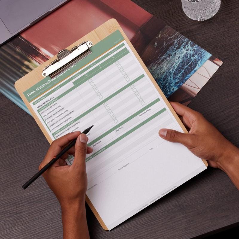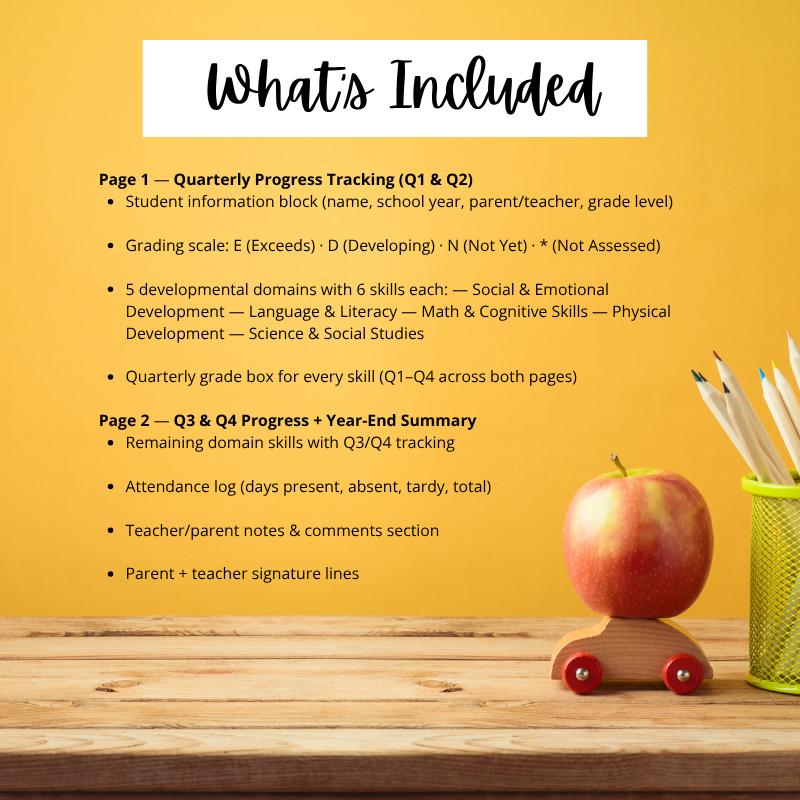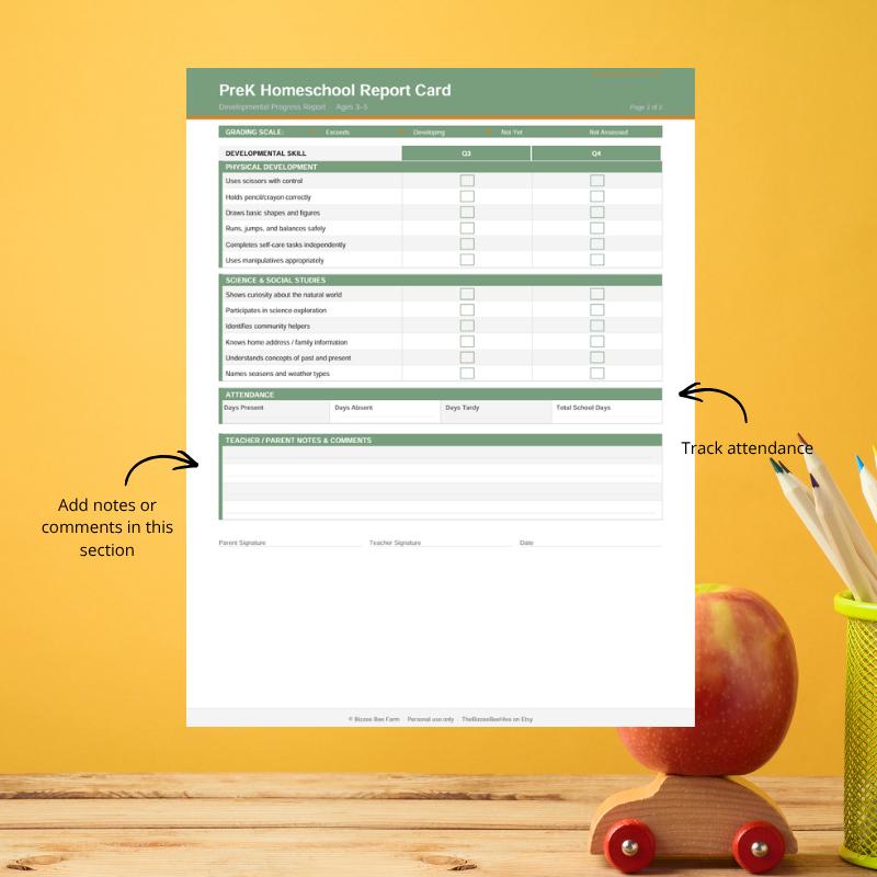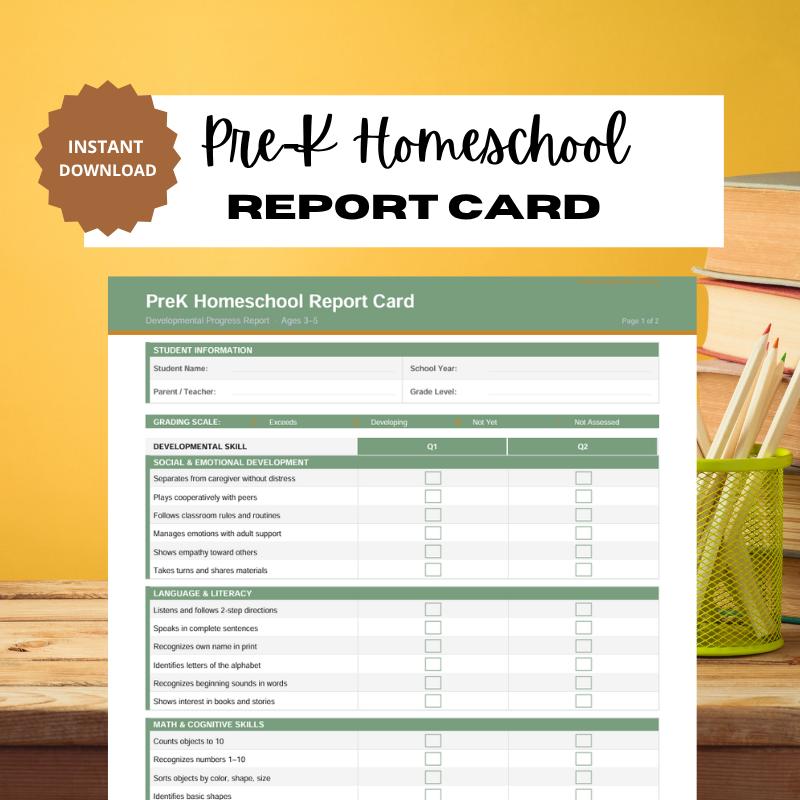 This PreK Homeschool Report Card is designed specifically for ages 3–5 — using a developmental milestone format instead of letter grades, because that's what actually reflects how young children learn. Track progress across all major domains each quarter and keep a clean record of your child's growth from the very beginning.