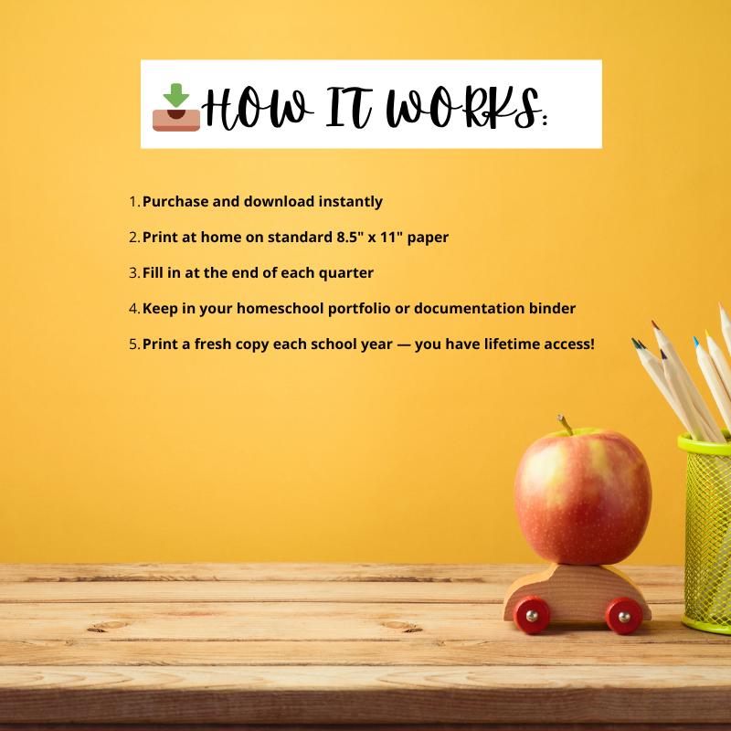Purchase and download instantly Print at home on standard 8.5" x 11" paper Fill in at the end of each quarter Keep in your homeschool portfolio or documentation binder Print a fresh copy each school year — you have lifetime access!