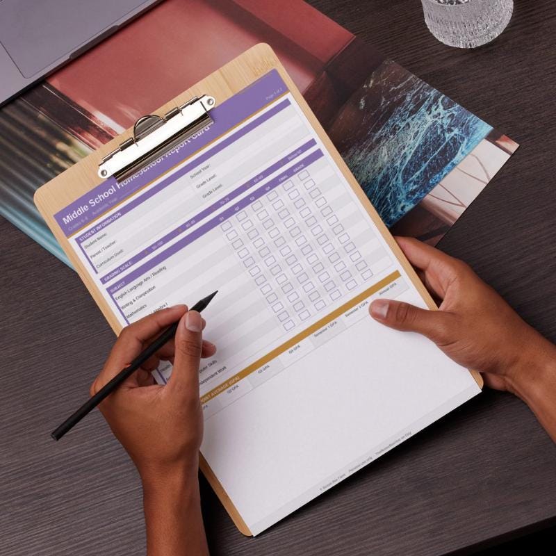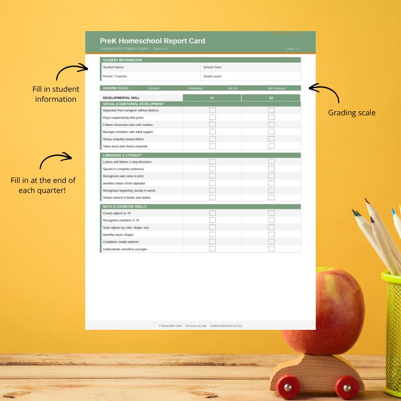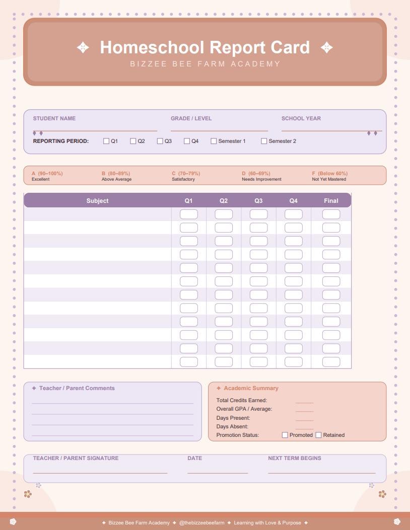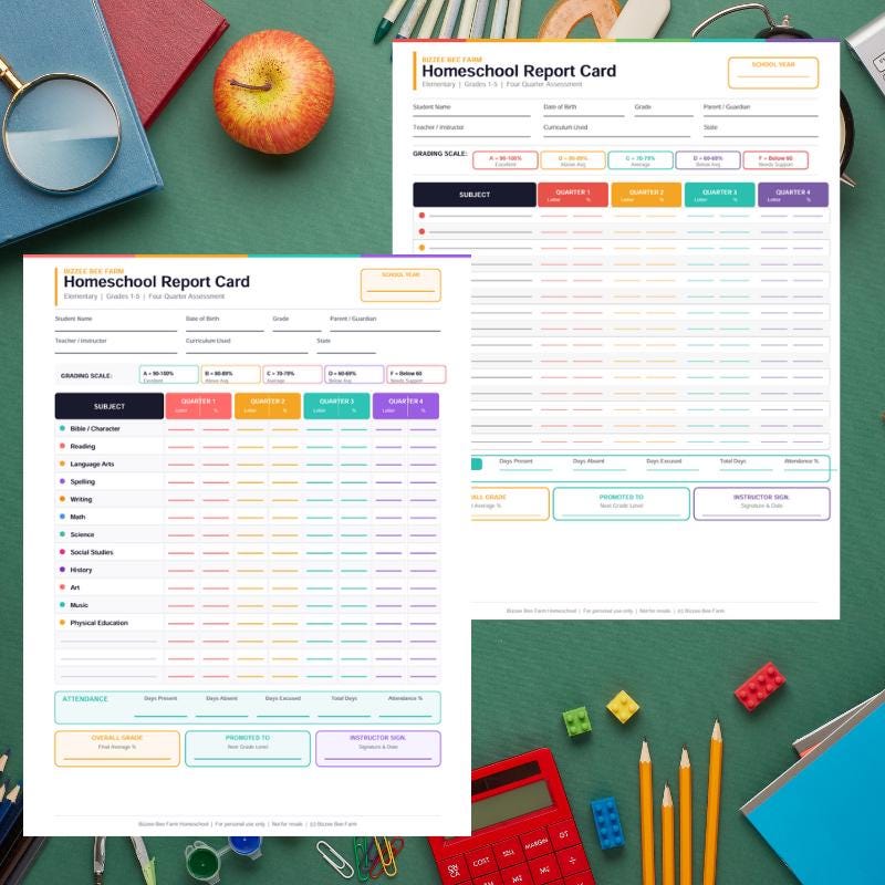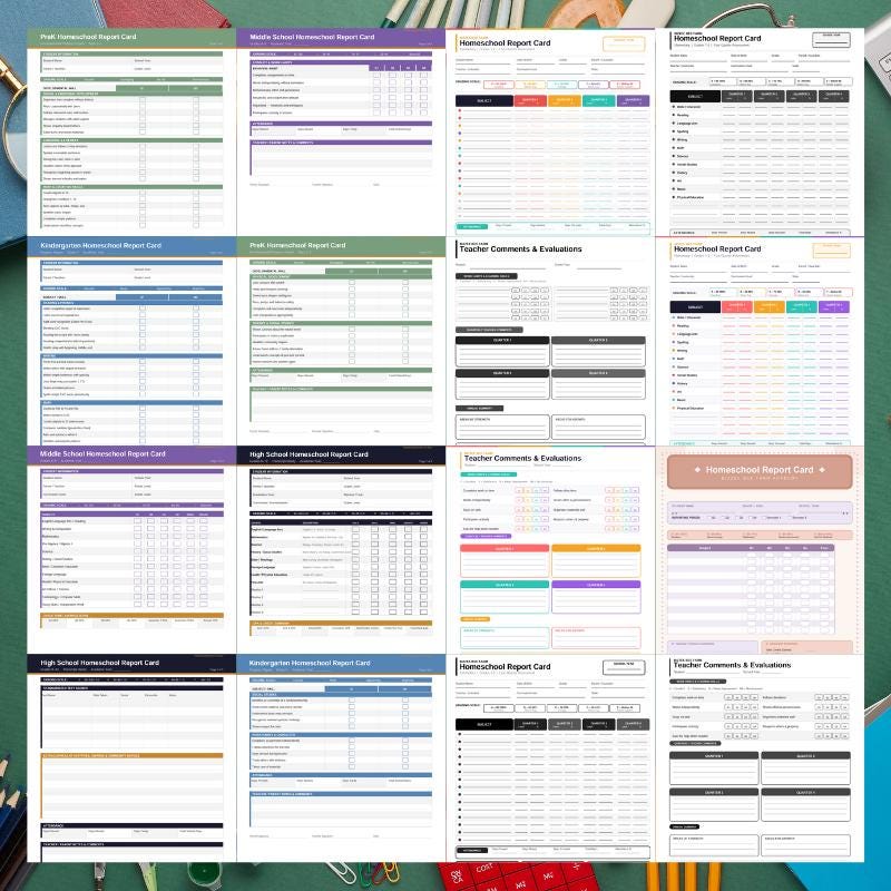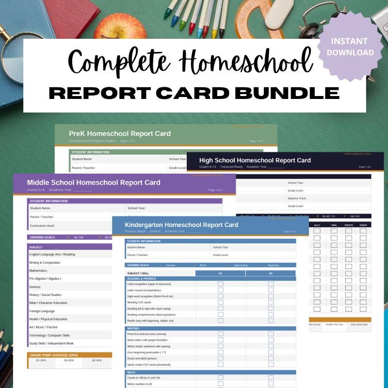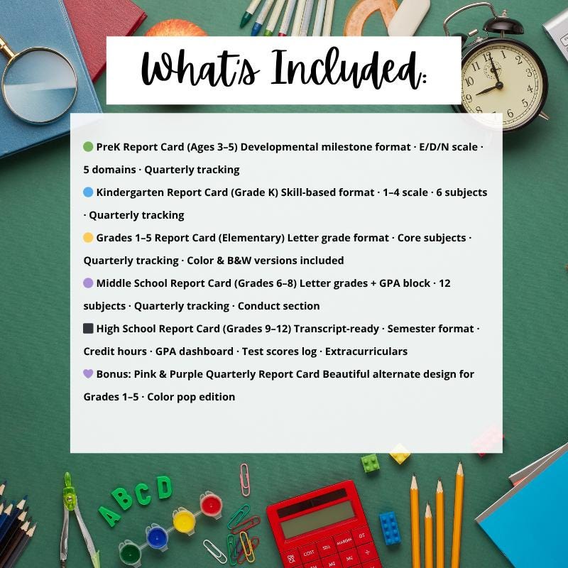 ✨ WHAT'S INCLUDED (6 Separate PDFs — Instant Download): 🟢 PreK Report Card (Ages 3–5) Developmental milestone format · E/D/N scale · 5 domains · Quarterly tracking 🔵 Kindergarten Report Card (Grade K) Skill-based format · 1–4 scale · 6 subjects · Quarterly tracking 🟡 Grades 1–5 Report Card (Elementary) Letter grade format · Core subjects · Quarterly tracking · Color & B&W versions included 🟣 Middle School Report Card (Grades 6–8) Letter grades + GPA block · 12 subjects · Quarterly tracking · Conduct section ⬛ High School Report Card (Grades 9–12) Transcript-ready · Semester format · Credit hours · GPA dashboard · Test scores log · Extracurriculars 💜 Bonus: Pink & Purple Quarterly Report Card Beautiful alternate design for Grades 1–5 · Color pop edition