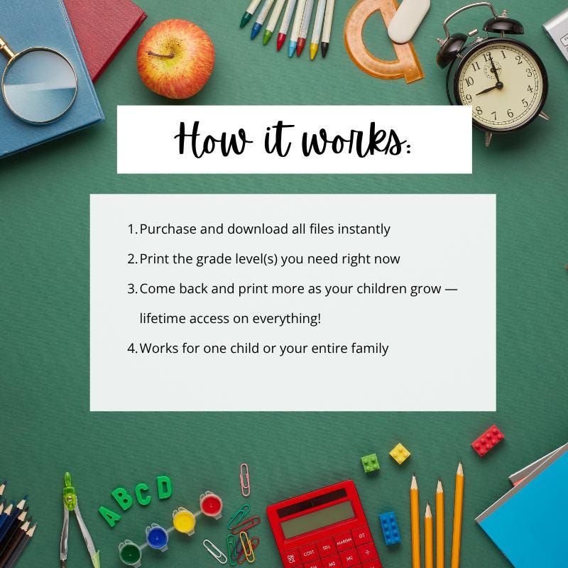 📥 HOW IT WORKS: Purchase and download all files instantly Print the grade level(s) you need right now Come back and print more as your children grow — lifetime access on everything! Works for one child or your entire family