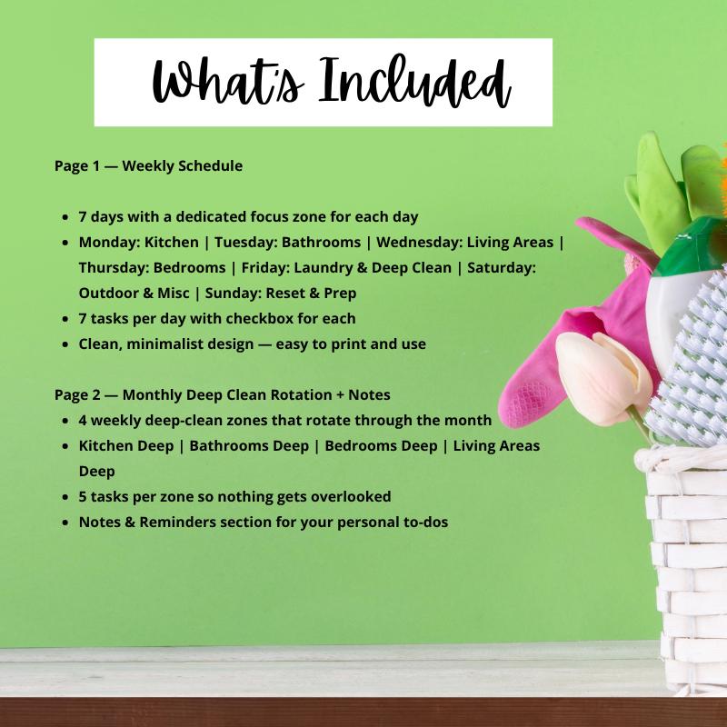 4 weekly deep-clean zones that rotate through the month Kitchen Deep | Bathrooms Deep | Bedrooms Deep | Living Areas Deep 5 tasks per zone so nothing gets overlooked Notes & Reminders section for your personal to-dos
