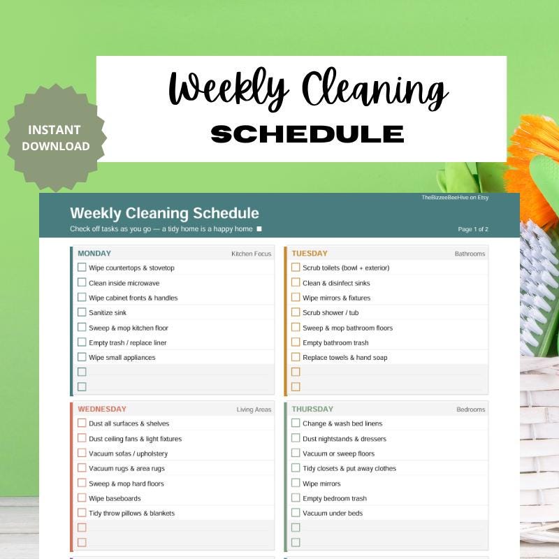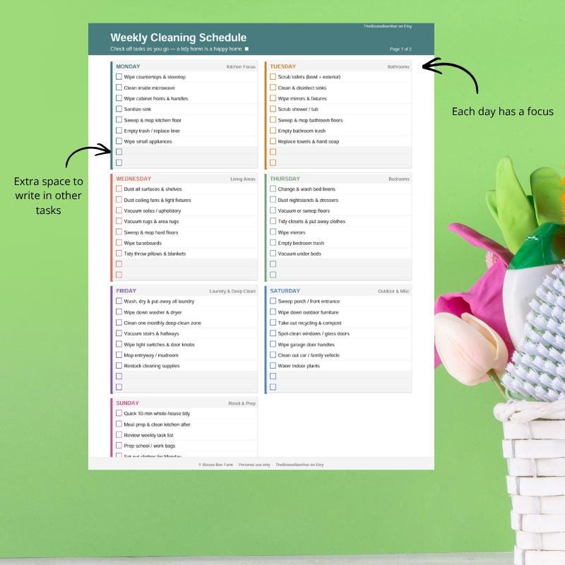 This printable Weekly Cleaning Schedule takes the guesswork out of keeping your home clean — without spending your whole day doing it. Each day of the week is assigned a focus zone so tasks stay manageable, and a Monthly Deep Clean Rotation makes sure nothing gets forgotten.