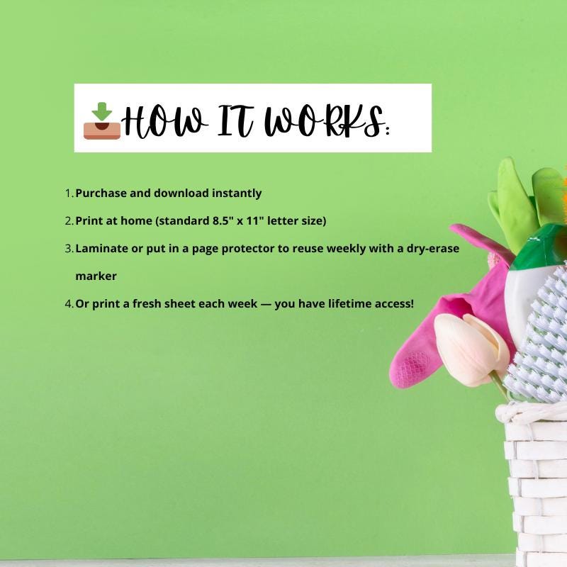 Purchase and download instantly Print at home (standard 8.5" x 11" letter size) Laminate or put in a page protector to reuse weekly with a dry-erase marker Or print a fresh sheet each week — you have lifetime access!