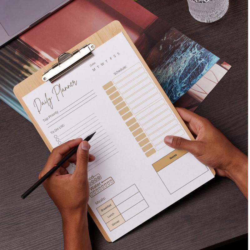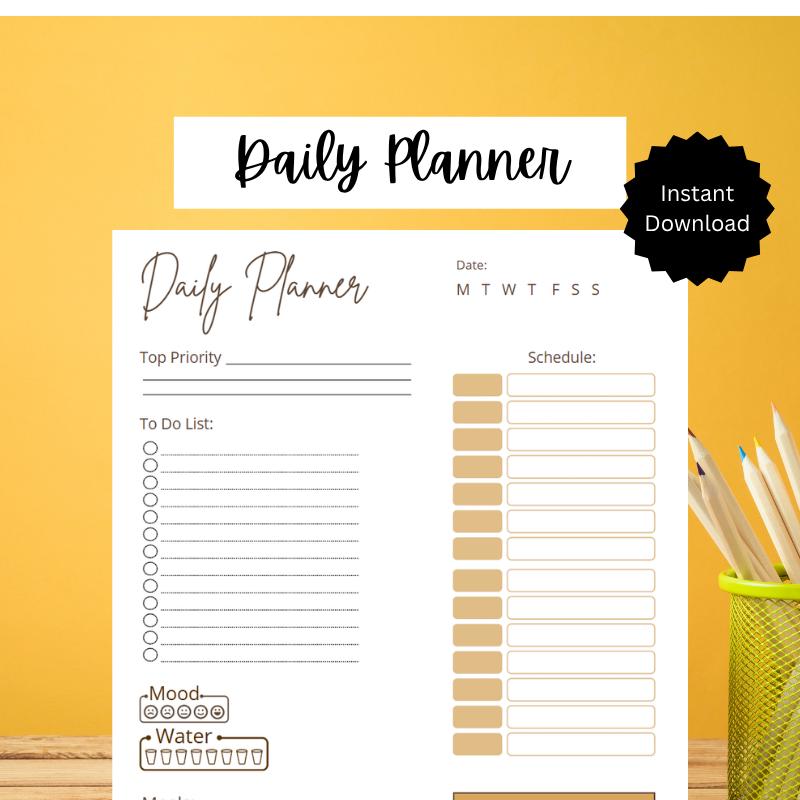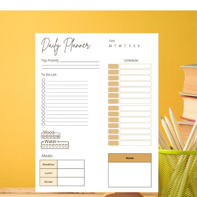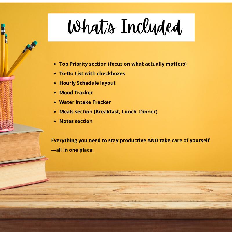 Top Priority section (focus on what actually matters) To-Do List with checkboxes Hourly Schedule layout Mood Tracker Water Intake Tracker Meals section (Breakfast, Lunch, Dinner) Notes section